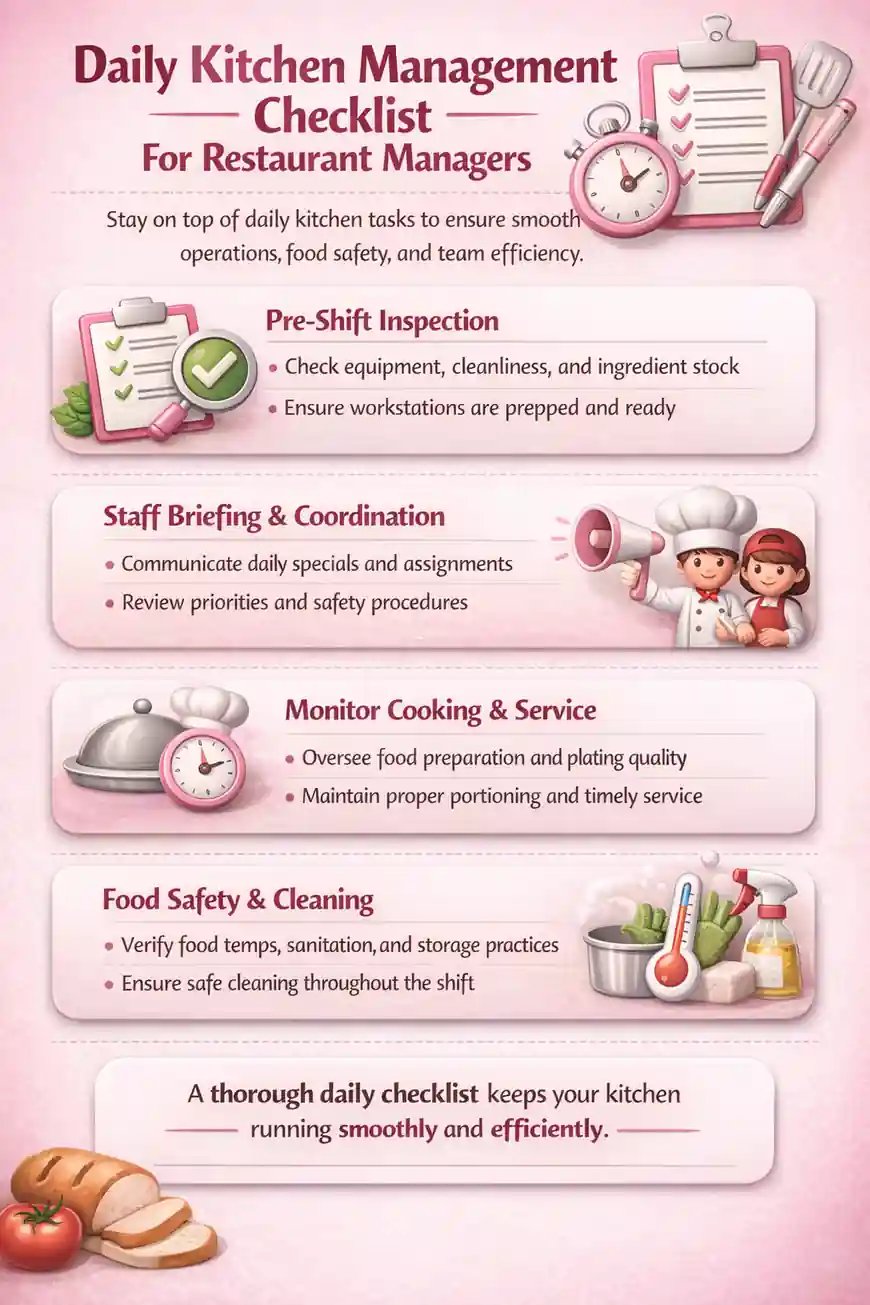 A daily kitchen management checklist isn’t about micromanaging—it’s about creating repeatable discipline. When these checks happen every day, the kitchen becomes predictable, safer, and easier to manage under pressure.